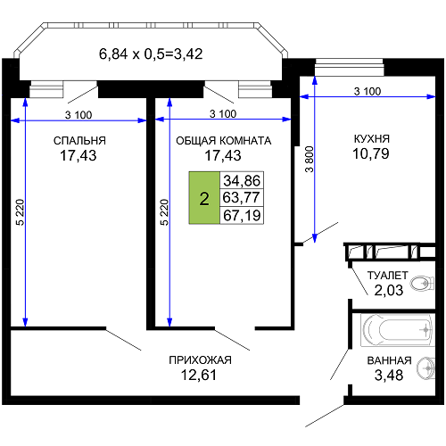 Продается 2-х комн. новостройка, 67.19 кв.м., 12/19 эт