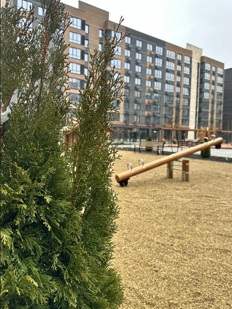 Прогулочные аллеи, велодорожка, игровые площадки для детей, места для отдыха взрослых, спортивные площадки, магазины, места для парковки велосипедов, колясок и самокатов.