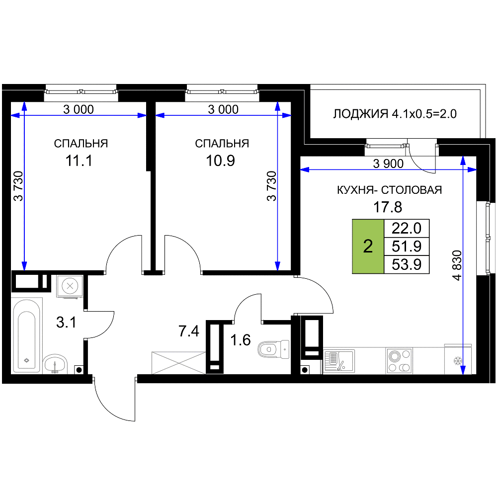 Продается 2-х комн. новостройка, 54.7 кв.м., 7/16 эт