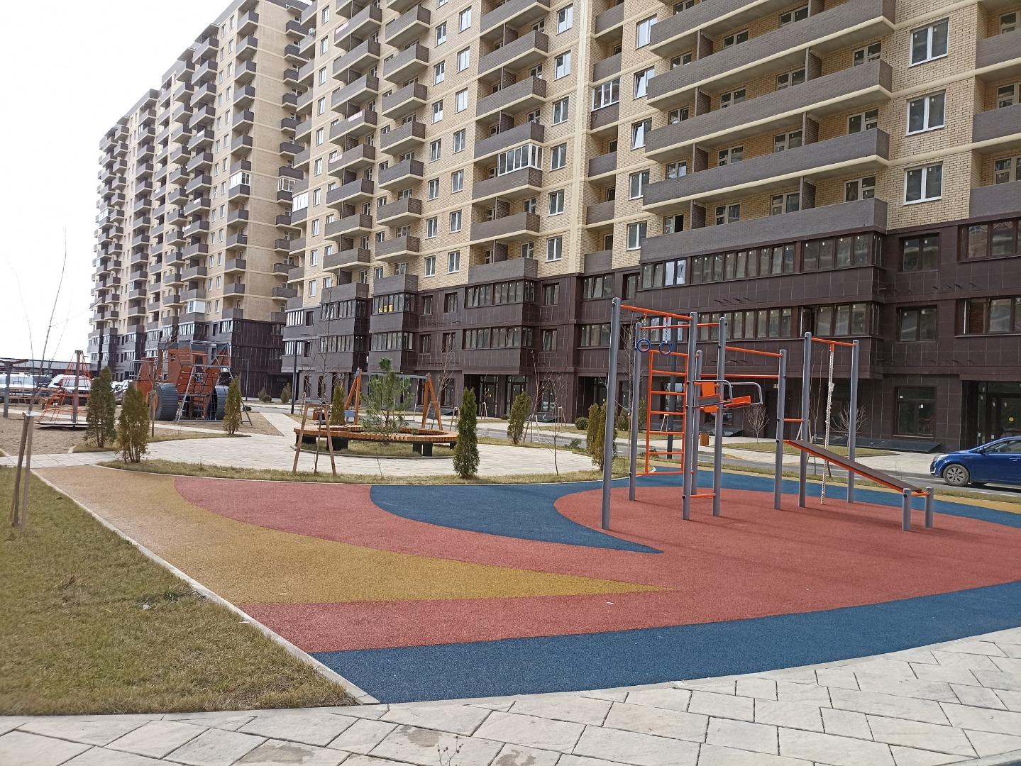 Широкие дворы, детские и спортивные площадки, множество коммерческих помещений.