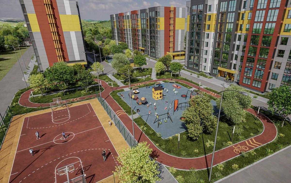 Красивые, зеленые дворы, детские и спортивные площадки, прогулочные аллеи.