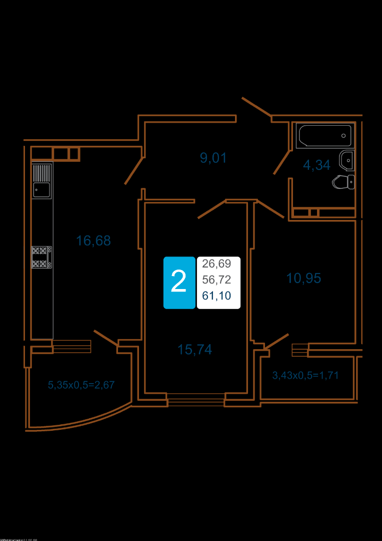 Продается 2-х комн. новостройка, 61.1 кв.м., 6/16 эт