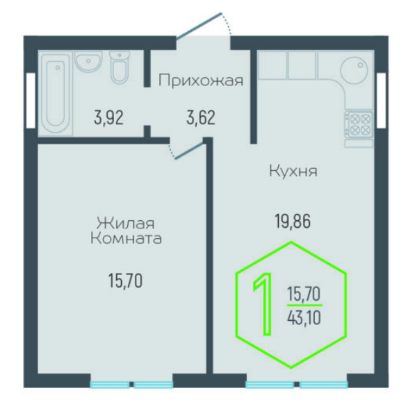 Продается однокомнатная новостройка, 43.1 кв.м., 2/3 эт