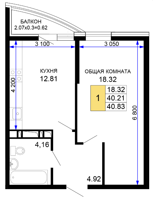 Продается однокомнатная новостройка, 41.24 кв.м., 8/19 эт
