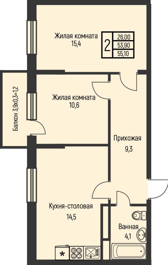 Продается 2-х комн. новостройка, 55.1 кв.м., 2/3 эт