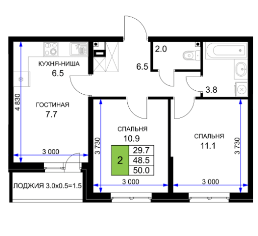 Продается 2-х комн. новостройка, 50 кв.м., 9/16 эт