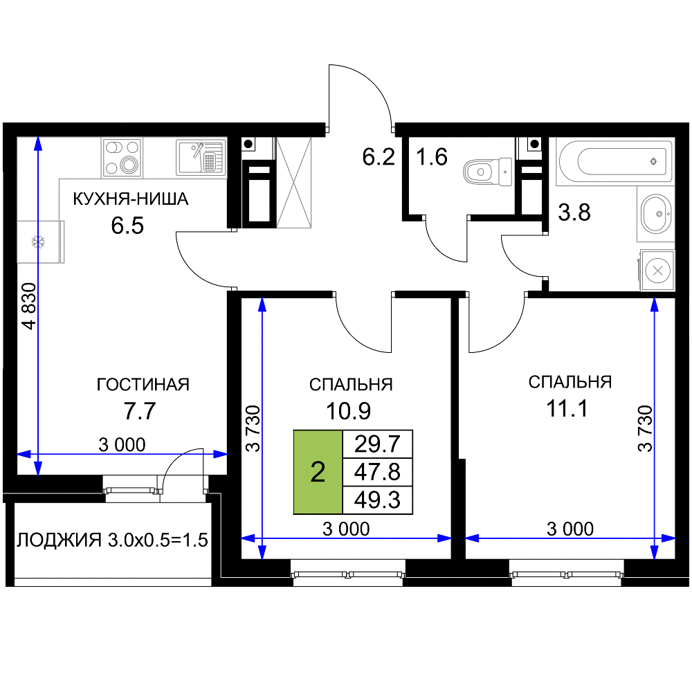 Продается 2-х комн. новостройка, 49.3 кв.м., 5/16 эт