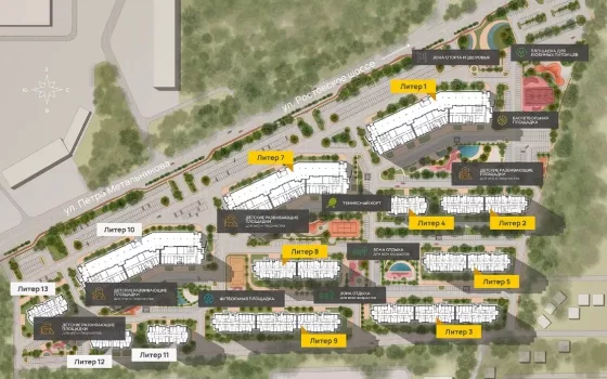 Сам комплекс выполнен в современном стиле, технология строительства монолит-кирпич, дизайнерские входные группы, безбарьерная среда, детские и спортивные площадки, теннисный корт, зеленая территория, подземный паркинг.