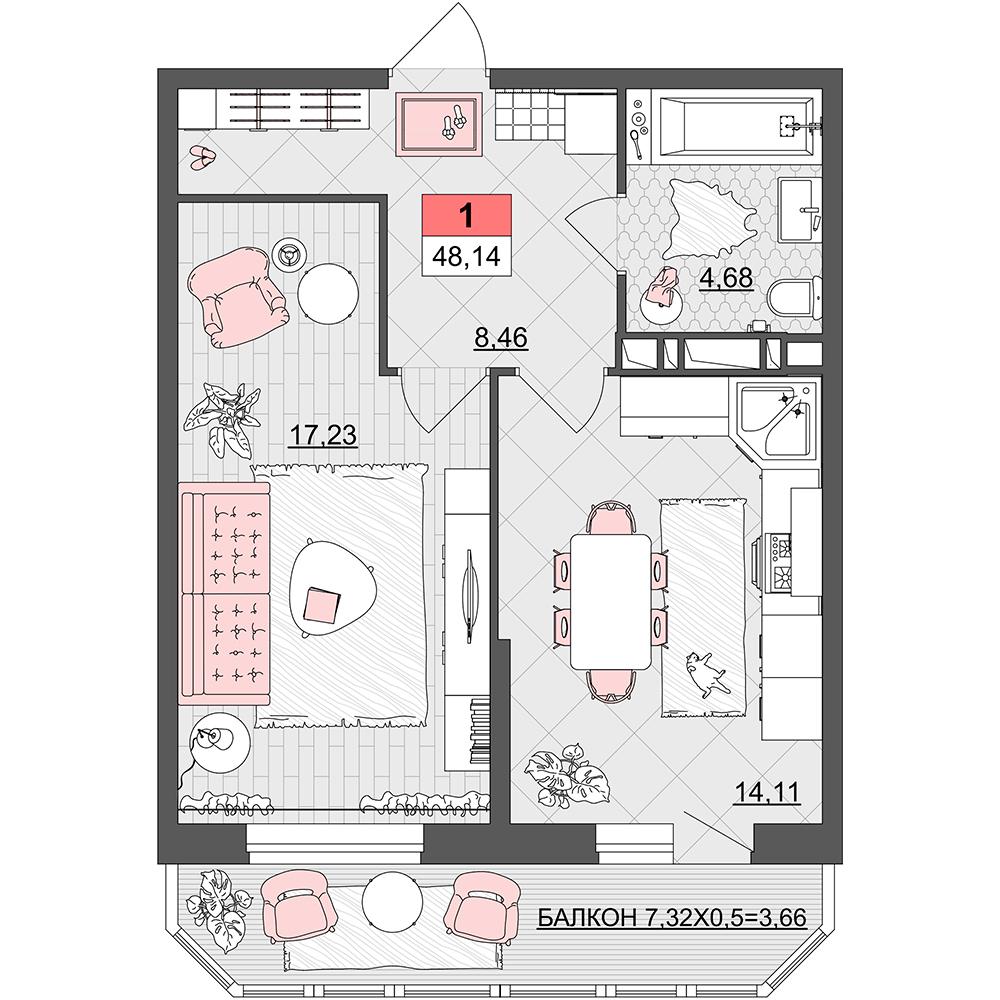 Продается однокомнатная новостройка, 48 кв.м., 8/24 эт