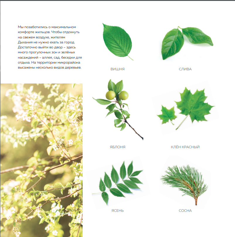 Мы позаботились о максимальном комфорте жильцов. Чтобы отдохнуть на свежем воздухе, жителям Дыхания не нужно ехать за город. Достаточно выйти во двор – здесь много прогулочных зон и зелёных насаждений – аллея, сад, беседки для отдыха. На территории микрорайона высажены несколько видов деревьев.