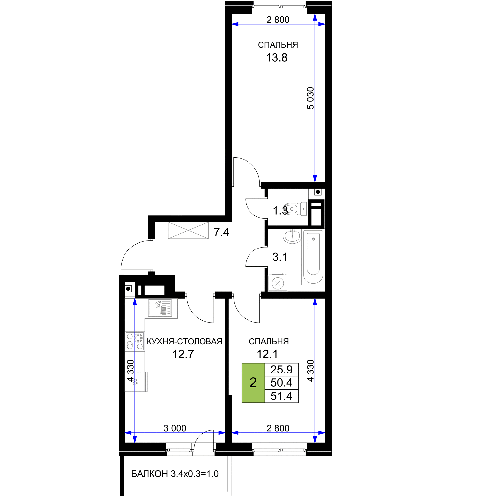 | Площадь, кв.м. | 51.4 |