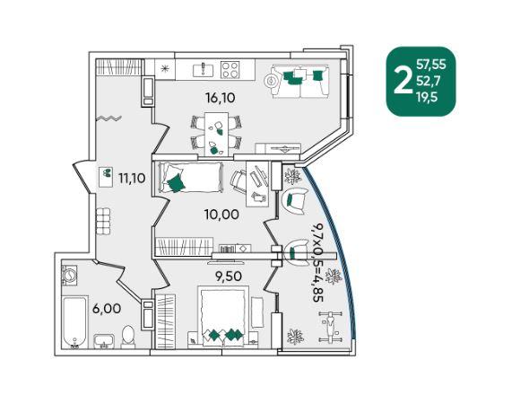 Продается 2-х комн. новостройка, 57.55 кв.м., 9/24 эт