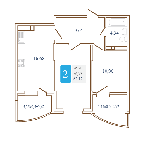 Продается 2-х комн. новостройка, 64.25 кв.м., 12/16 эт