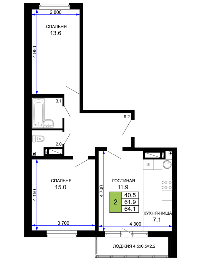 Продается 2-х комн. новостройка, 64.1 кв.м., 16/24 эт