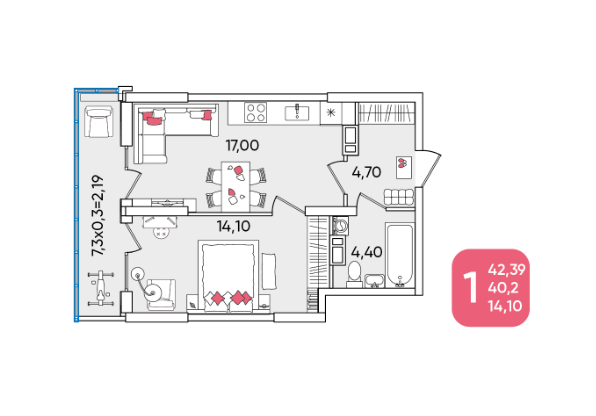 Продается однокомнатная новостройка, 42.3 кв.м., 9/24 эт