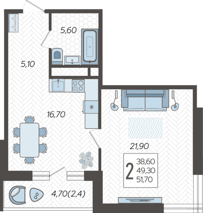 Продается 2-х комн. новостройка, 51.7 кв.м., 12/16 эт