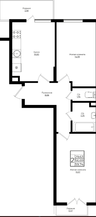 Продается 2-х комн. новостройка, 59.74 кв.м., 4/10 эт