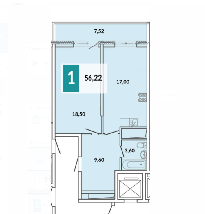 Продается однокомнатная новостройка, 56.22 кв.м., 17/22 эт