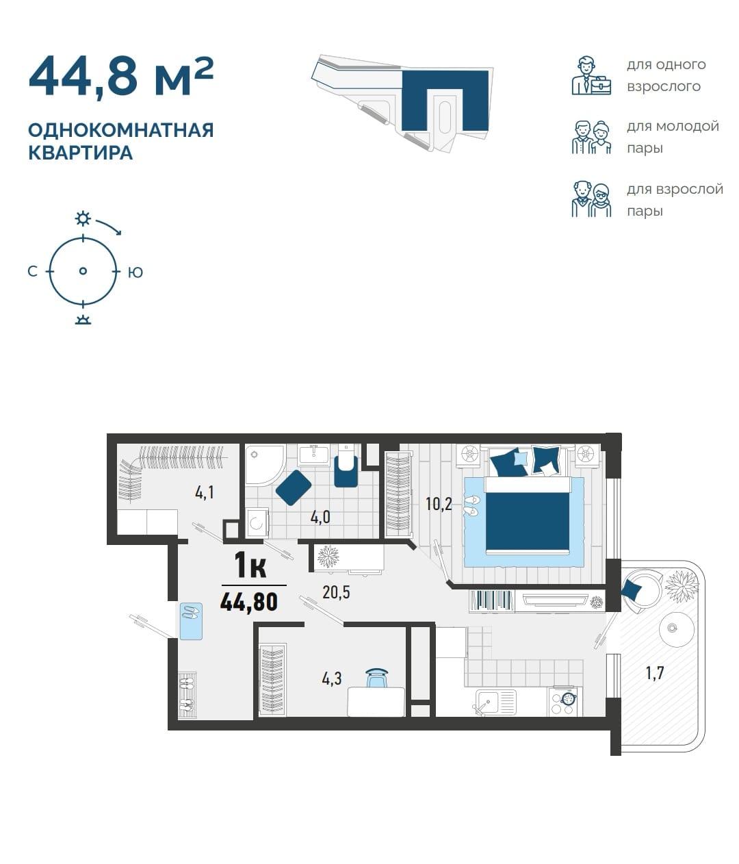 Продается однокомнатная новостройка, 45 кв.м., 3/3 эт