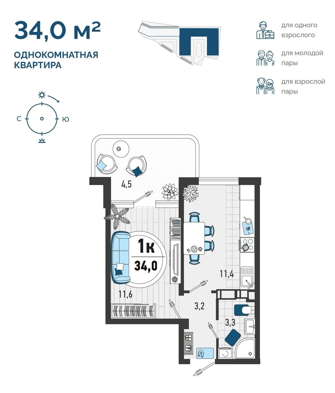 Продается однокомнатная новостройка, 34 кв.м., 1/3 эт