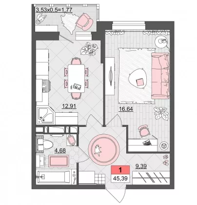 Продается однокомнатная новостройка, 45 кв.м., 8/16 эт