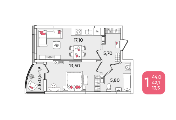 Продается однокомнатная новостройка, 44 кв.м., 16/24 эт