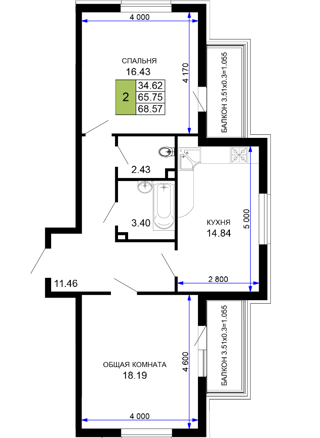 Двухкомнатная квартира в строящемся комплексе класса комфорт+