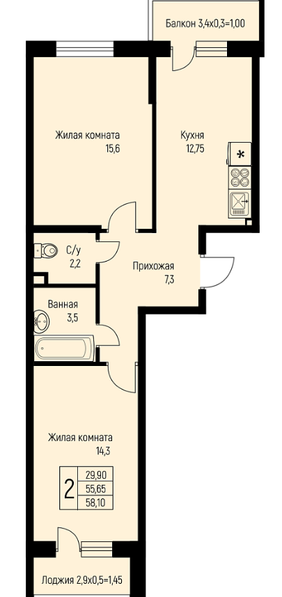 Продается 2-х комн. новостройка, 58.1 кв.м., 1/3 эт