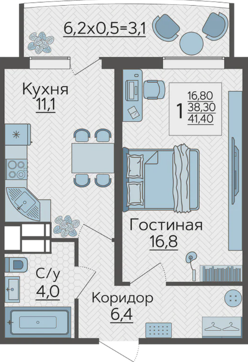 Продается однокомнатная новостройка, 41.9 кв.м., 6/16 эт