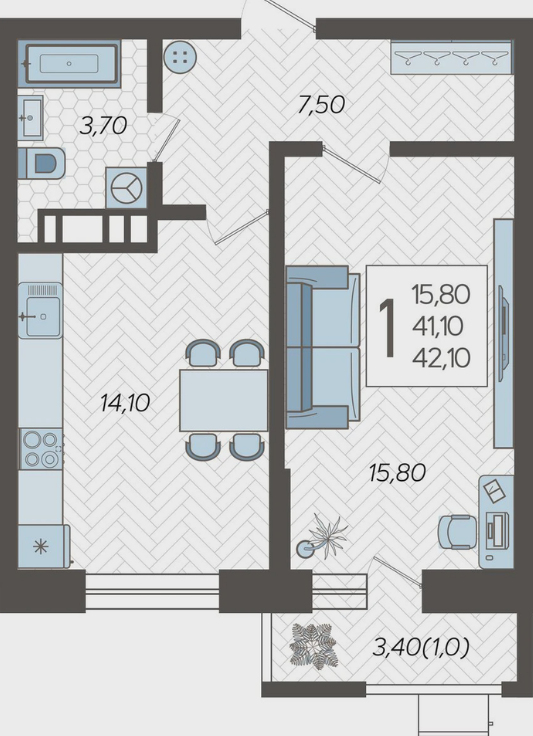 Продается однокомнатная новостройка, 42.1 кв.м., 9/12 эт