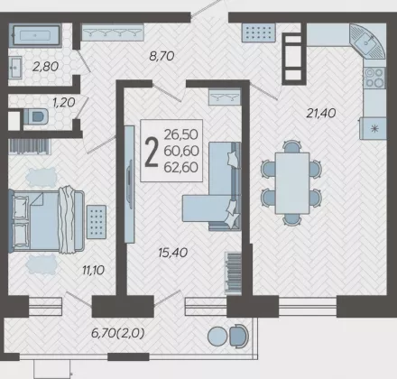 Продается 2-х комн. новостройка, 62.6 кв.м., 8/12 эт
