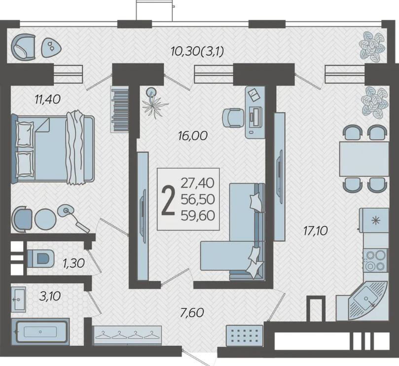 Продается 2-х комн. новостройка, 59.6 кв.м., 8/12 эт