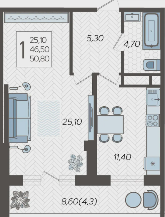 Продается однокомнатная новостройка, 50.8 кв.м., 10/16 эт
