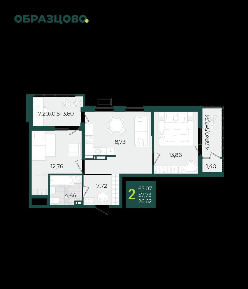 Продается 2-х комн. новостройка, 65.2 кв.м., 13/21 эт