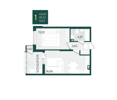 Продается однокомнатная новостройка, 43.03 кв.м., 8/21 эт