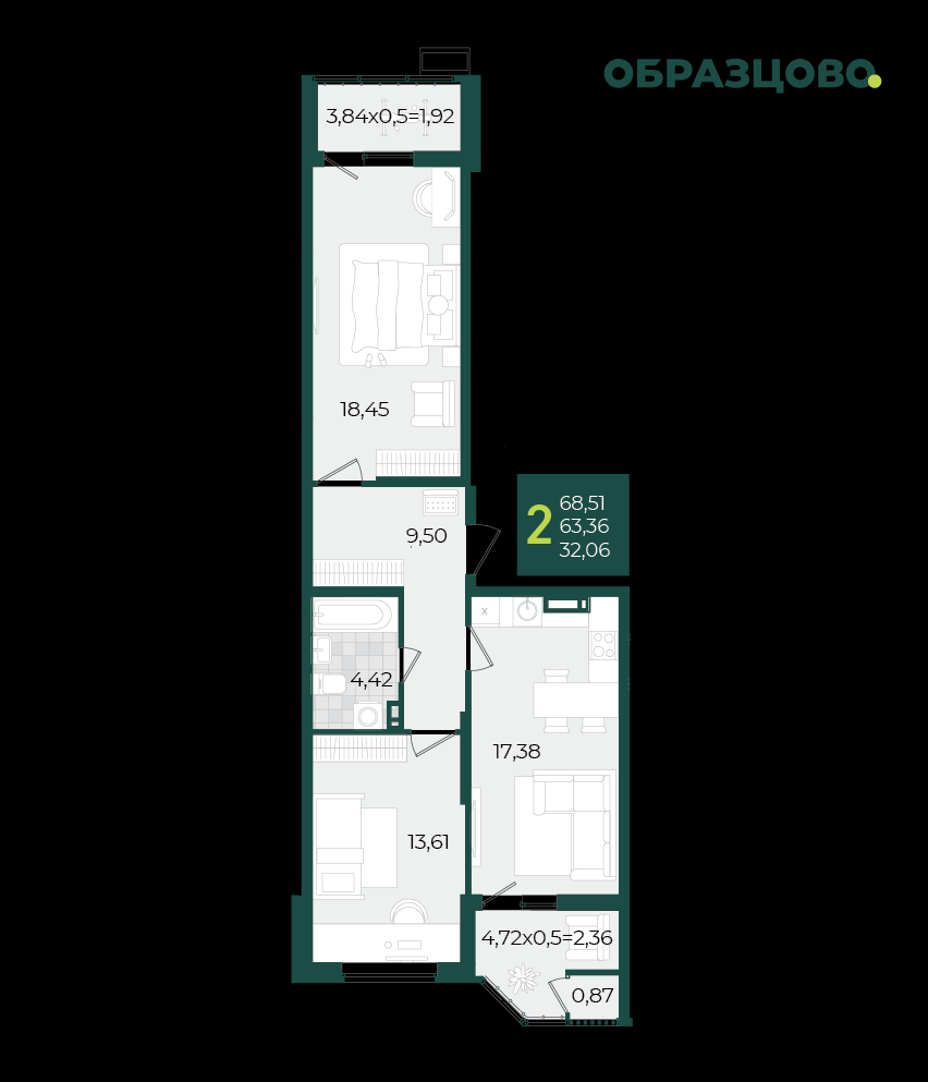 Продается 2-х комн. новостройка, 68.51 кв.м., 19/21 эт