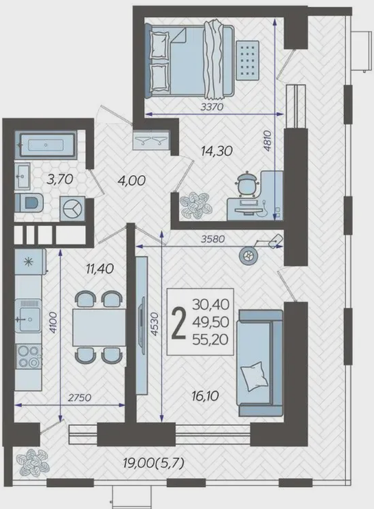 Продается 2-х комн. новостройка, 55.2 кв.м., 5/12 эт