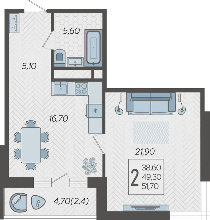 Продается однокомнатная новостройка, 51.7 кв.м., 10/16 эт