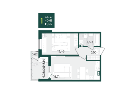 Продается однокомнатная новостройка, 44.37 кв.м., 10/21 эт
