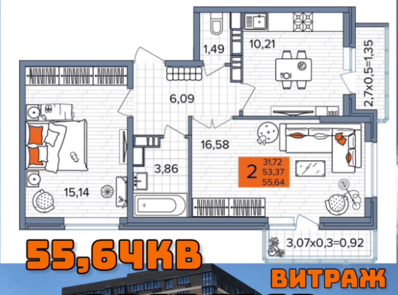 Продается 2-х комн. новостройка, 55.64 кв.м., 8/16 эт