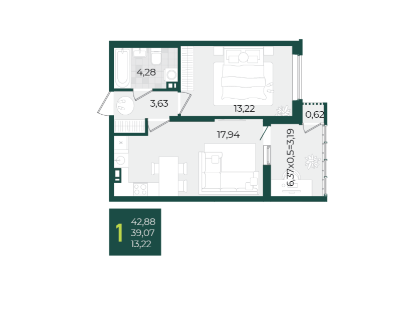 Продается однокомнатная новостройка, 42.88 кв.м., 5/21 эт