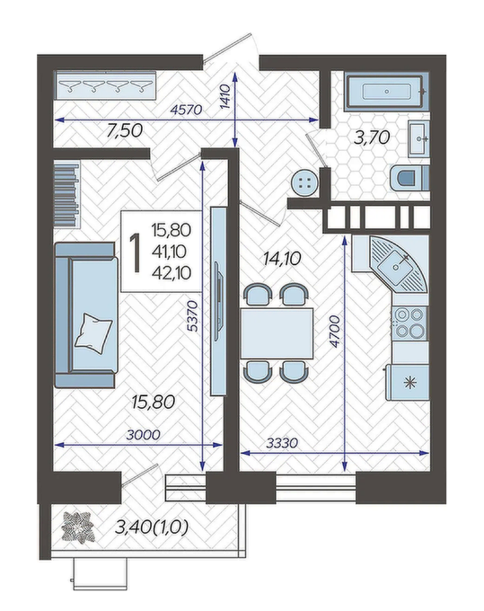 Продается однокомнатная новостройка, 42.1 кв.м., 11/12 эт