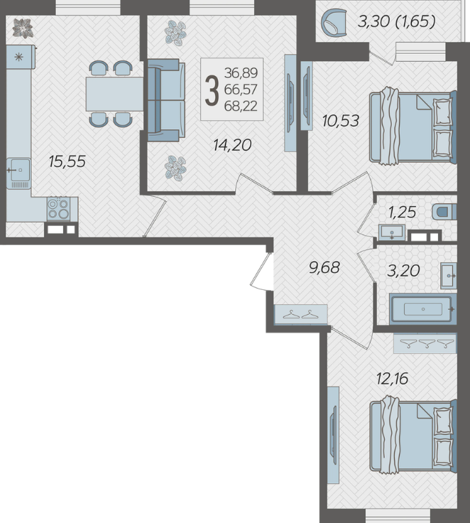 Продается 3-х комн. новостройка, 68.22 кв.м., 7/19 эт