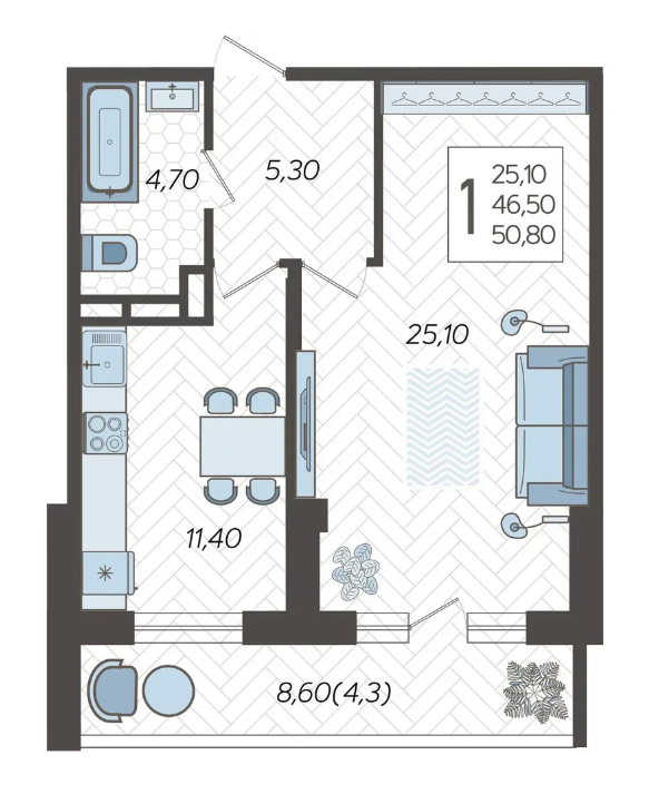 Продается однокомнатная новостройка, 50.8 кв.м., 9/16 эт
