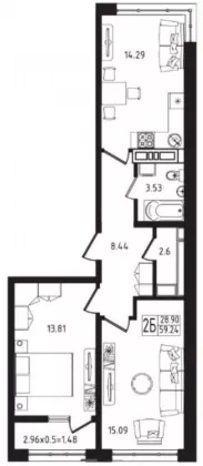 Продается 2-х комн. новостройка, 59.2 кв.м., 5/9 эт