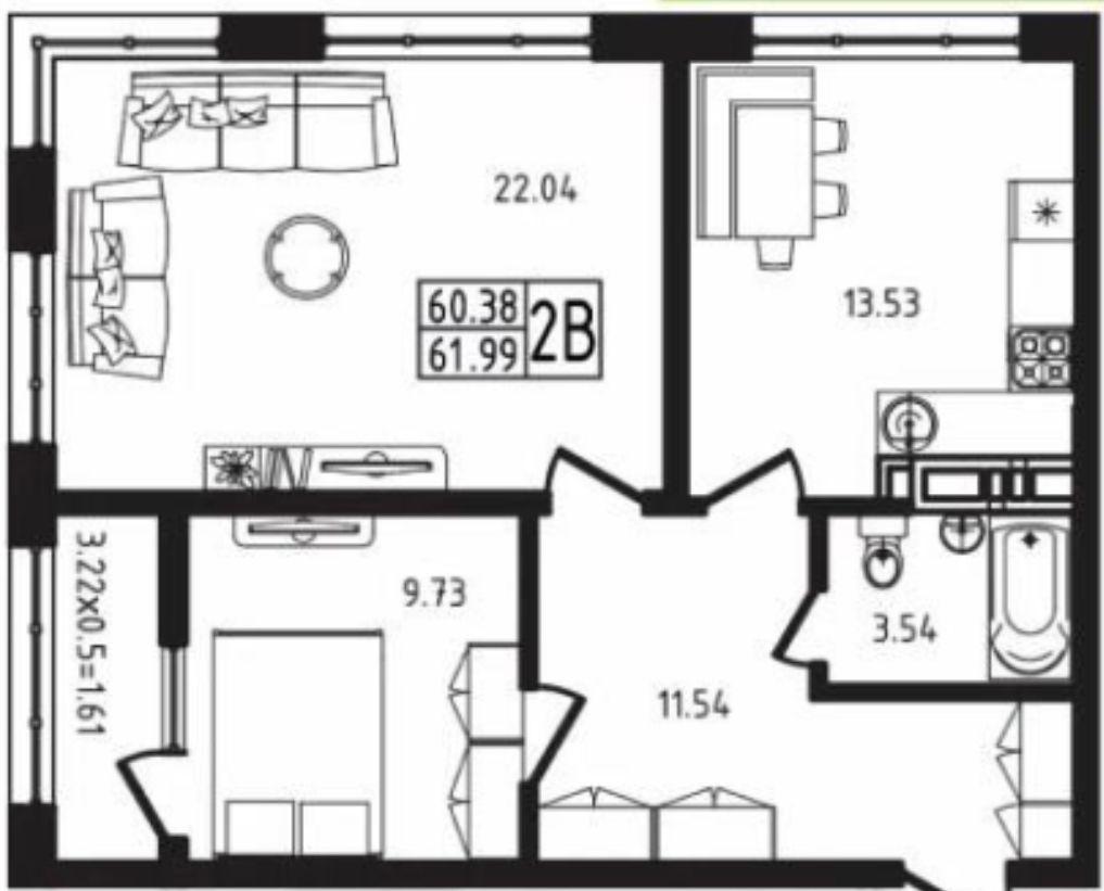 Продается 2-х комн. новостройка, 62 кв.м., 6/9 эт