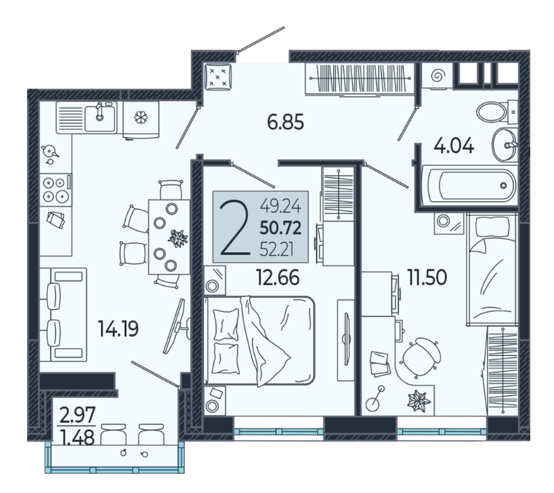Продается 2-х комн. новостройка, 52.21 кв.м., 7/21 эт