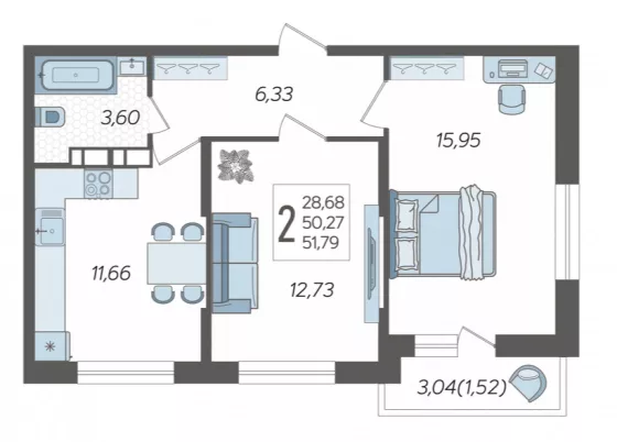 Продается 3-х комн. новостройка, 51.79 кв.м., 15/19 эт