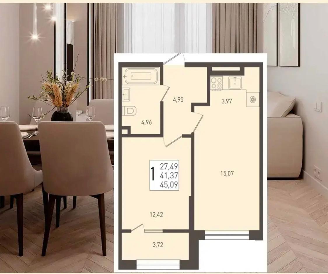 Продается однокомнатная новостройка, 45 кв.м., 6/8 эт