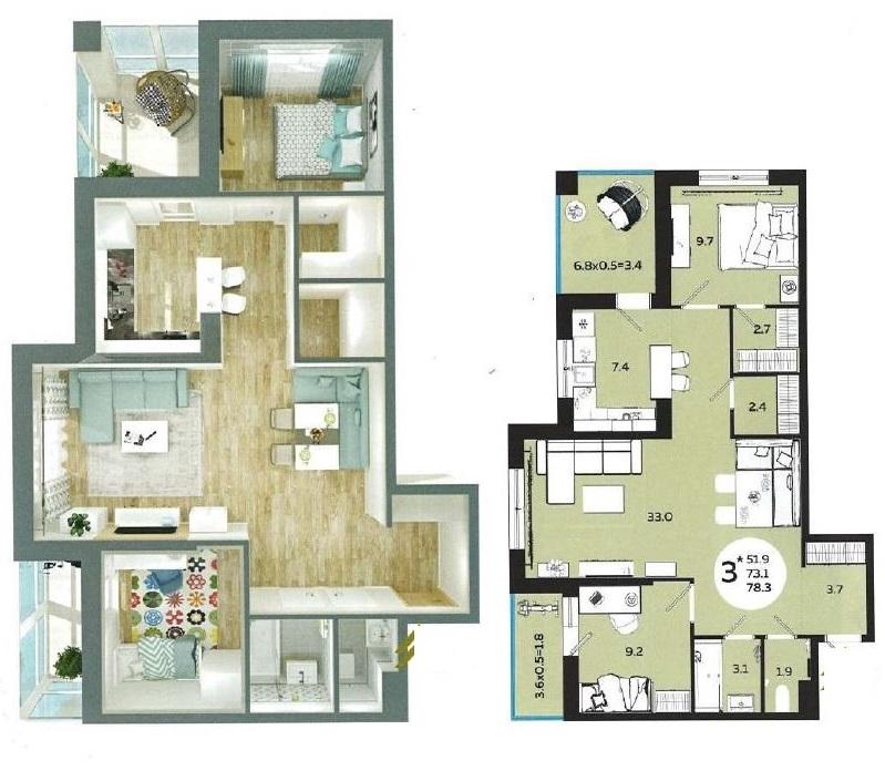 Продается 3-х комн. новостройка, 78.3 кв.м., 8/24 эт